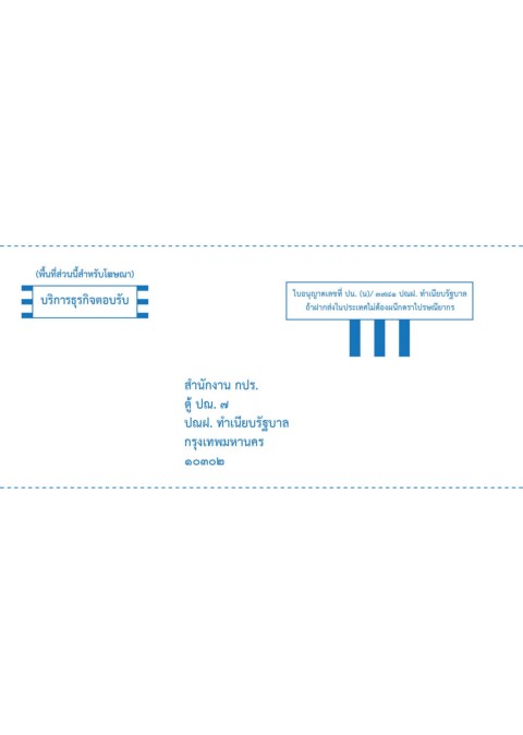 (พื้นที่สวนนี้สำหรับโฆษณา) บริการธุรกิจตอบรับ ใบอนุญาตเลขที่ ปน. (น)/ ๓๙๘๑ ปณฝ. ทำเนียบรัฐบาล ถาฝากสงในประเทศไมตองผนึกตราไปรษณียากร สำนักงาน กปร. ตู ปณ. ๗ ปณฝ. ทำเนียบรัฐบาล กรุงเทพมหานคร ๑๐๓๐๒