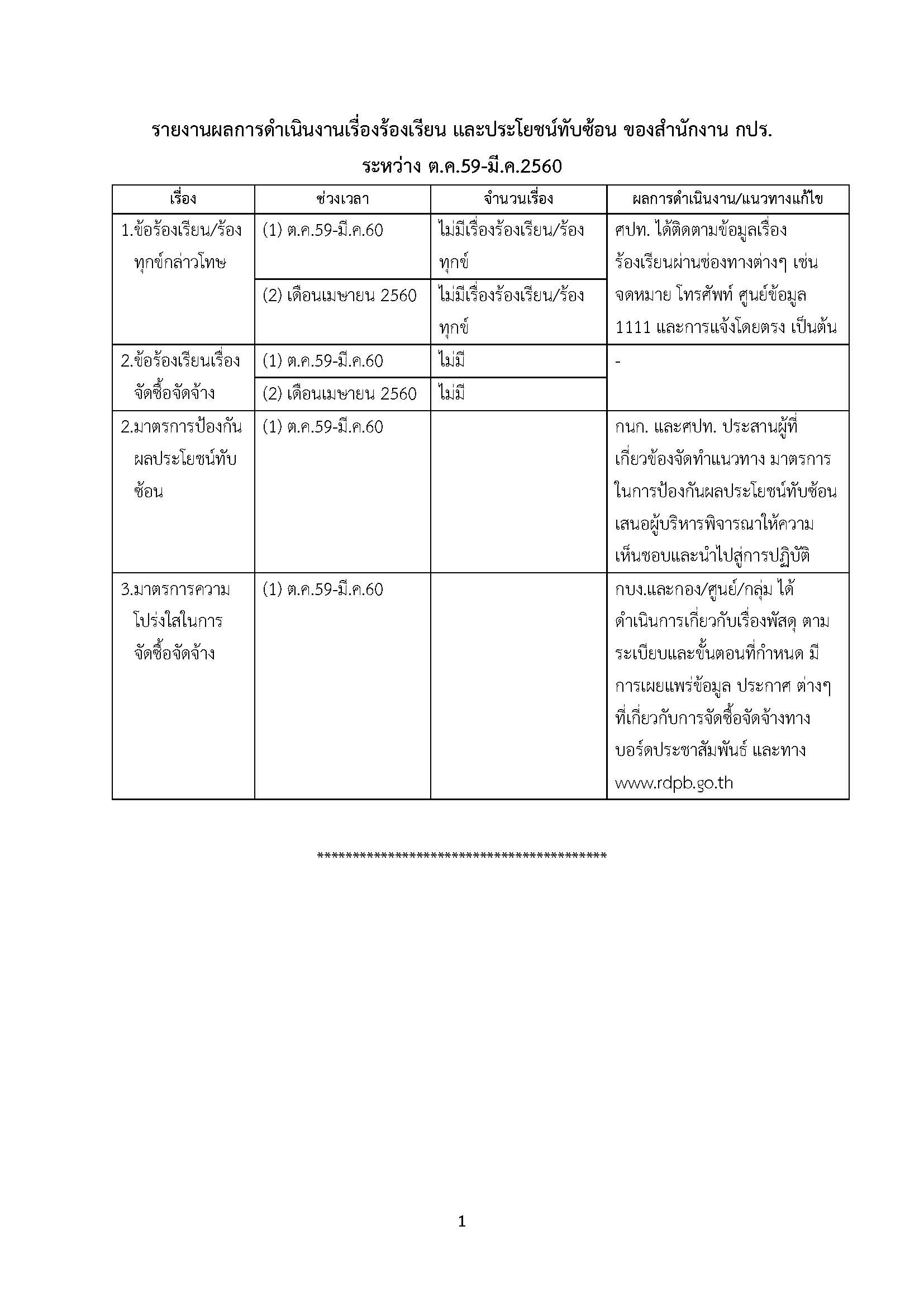 รายงานผลการดำเนินงานเรื่องร้องเรียน และประโยชน์ทับซ้อน ของสำนักงาน กปร.ระหว่าง ต.ค.59-มี.ค.2560
