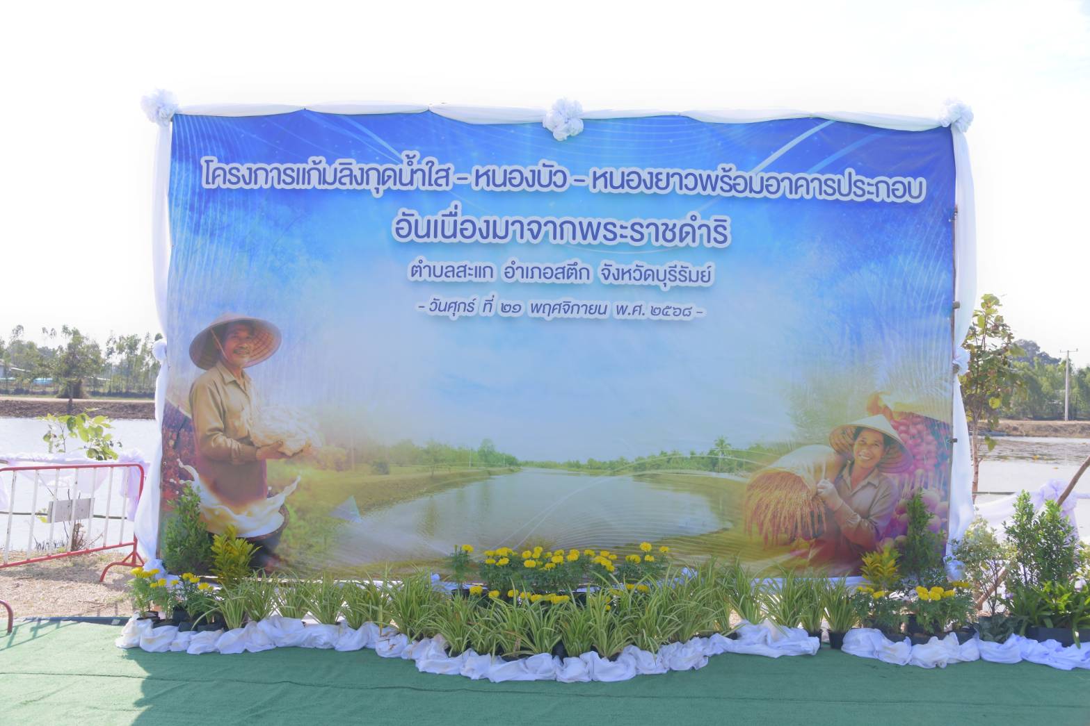 พระบาทสมเด็จพระบรมชนกาธิเบศร มหาภูมิพลอดุลยเดชมหาราช บรมนาถบพิตร ทรงพระกรุณาโปรดเกล้าฯ รับโครงการขุดลอกพื้นที่แก้มลิงหนองกุดน้ำใส หนองบัว และหนองยาว พร้อมทั้งก่อสร้างอาคารท่อรับน้ำและระบบระบายน้ำ และก่อสร้างอาคารบังคับน้ำ ไว้เป็นโครงการอันเนื่องมาจากพระราชดำริ เมื่อวันที่ 23 พฤศจิกายน 2554 ตามที่ราษฎรตำบลสะแก อำเภอสตึก จังหวัดบุรีรัมย์ ขอพระราชทานโครงการขุดลอกหนองบัว บริเวณบ้านสะแกและกุดน้ำใสบริเวณบ้านยางตาสาด ตำบลสะแก เพื่อช่วยเหลือราษฎรซึ่งประสบความเดือดร้อนขาดแคลนน้ำสำหรับอุปโภคบริโภค ทำการเกษตร และปศุสัตว์