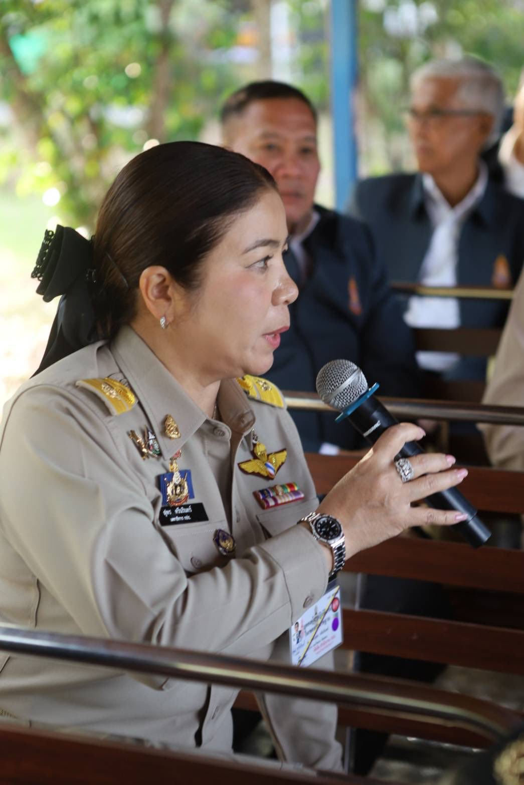 จากนั้น องคมนตรีกล่าวให้โอวาทและมอบแนวทางการดำเนินงานโครงการอันเนื่องมาจากพระราชดำริ พร้อมกับมอบเกียรติบัตรให้แก่เกษตรกร กลุ่มเกษตรกร โรงเรียนที่ผ่านการคัดเลือกระดับดีเด่น และผู้ทำประโยชน์ต่อศูนย์ศึกษาการพัฒนาภูพานฯ จำนวน 21 ราย ต่อจากนั้น เยี่ยมชมนิทรรศการของเกษตรกร กลุ่มเกษตรกร และโรงเรียนดีเด่น จากนั้น องคมนตรีนั่งรถรางไปยังงานศึกษาและพัฒนาด้านข้าว เพื่อรับฟังรายงานผลการดำเนินงาน และชมผลิตภัณฑ์แปรรูปจากข้าวพันธุ์ภูพาน 1 เช่น สแน็กบาร์ ไอศกรีมข้าว สมูทตี้ข้าวเหนียวแดง และไดฟูกุ จากนั้น รับฟังรายงานการบริหารจัดการน้ำของศูนย์ศึกษาการพัฒนาภูพานฯ ณ อาคาร Information